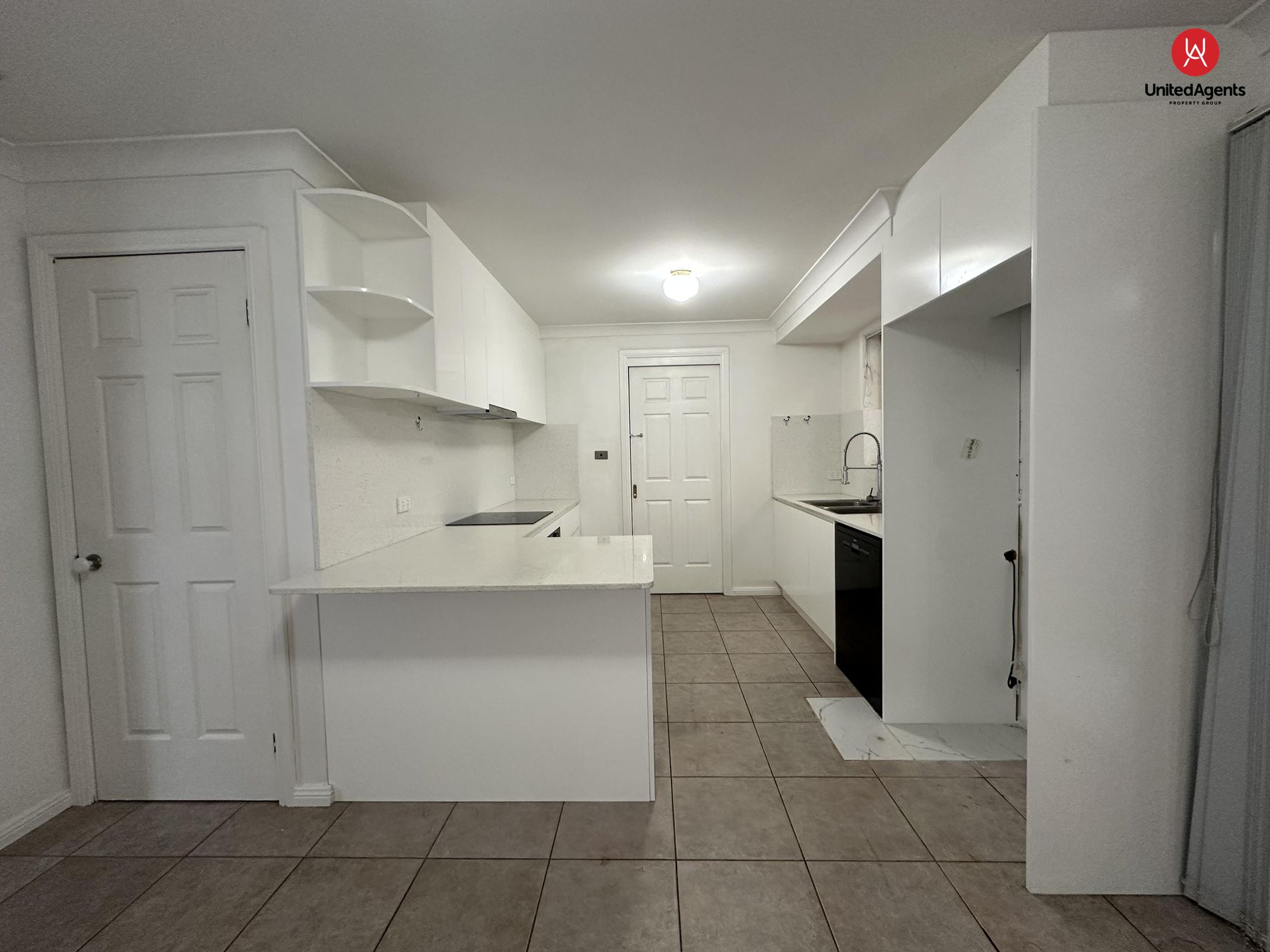 Spacious open-plan living area, fully tiled