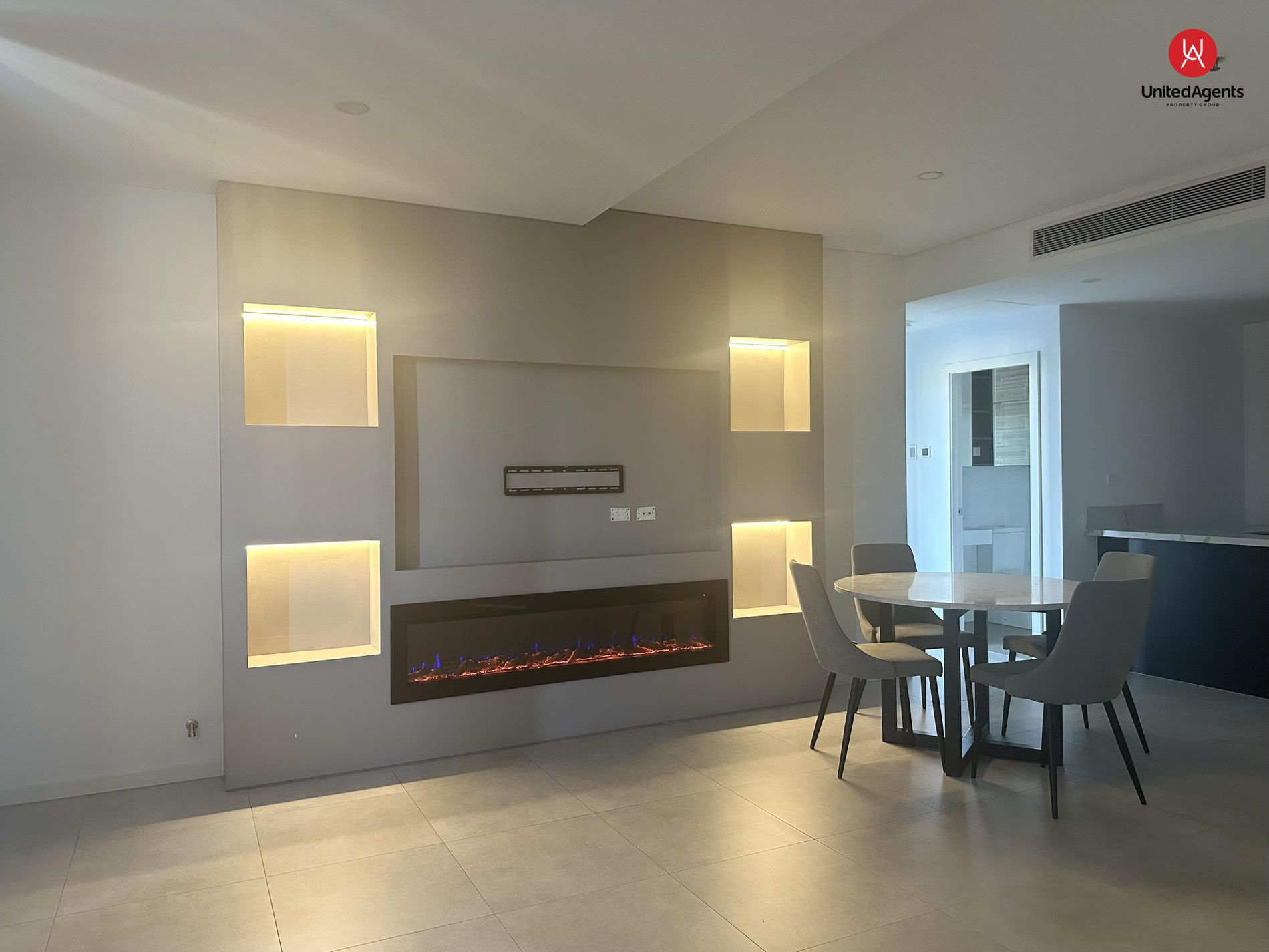• Light-filled open-plan living and dining area with a built-in electric fireplace
